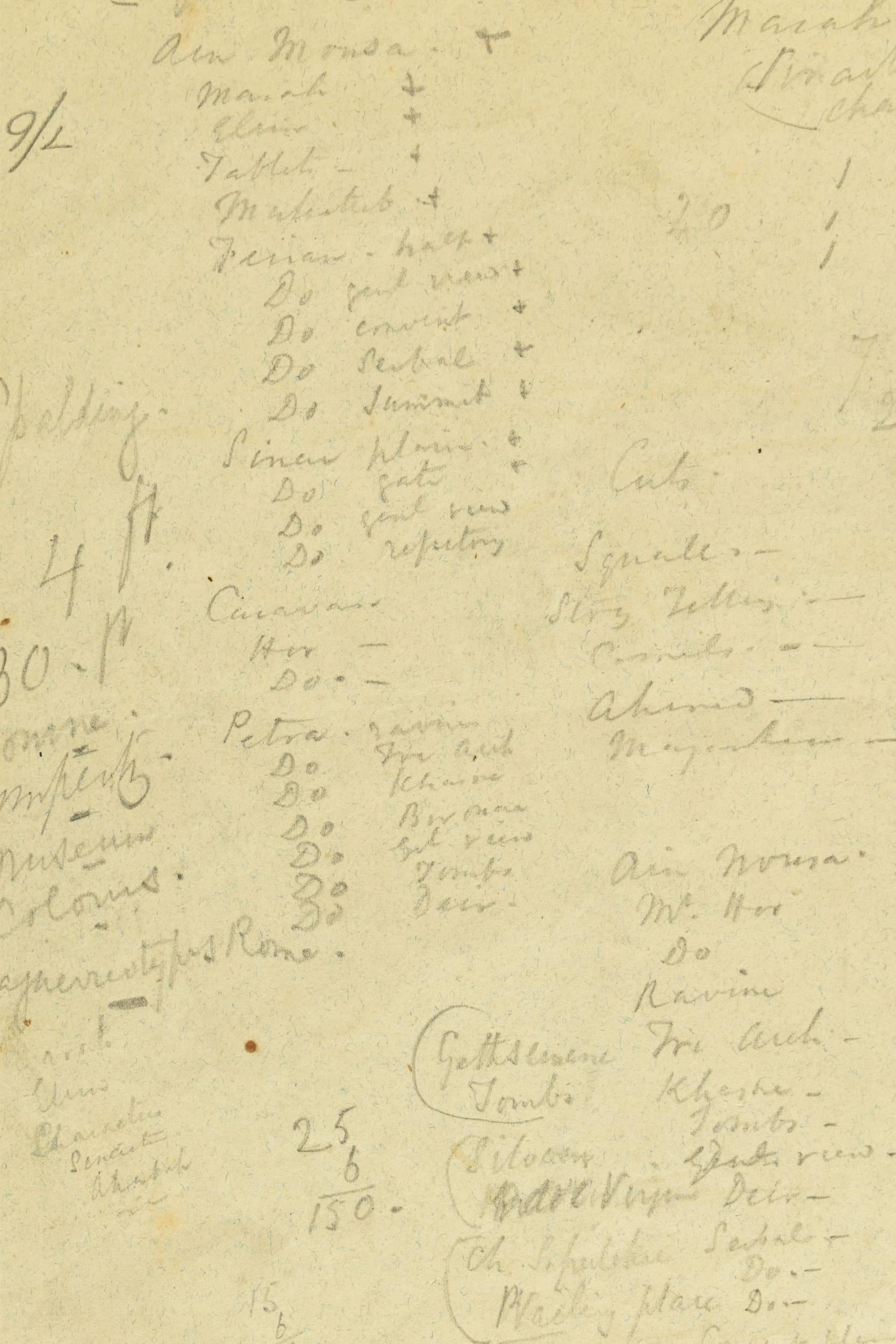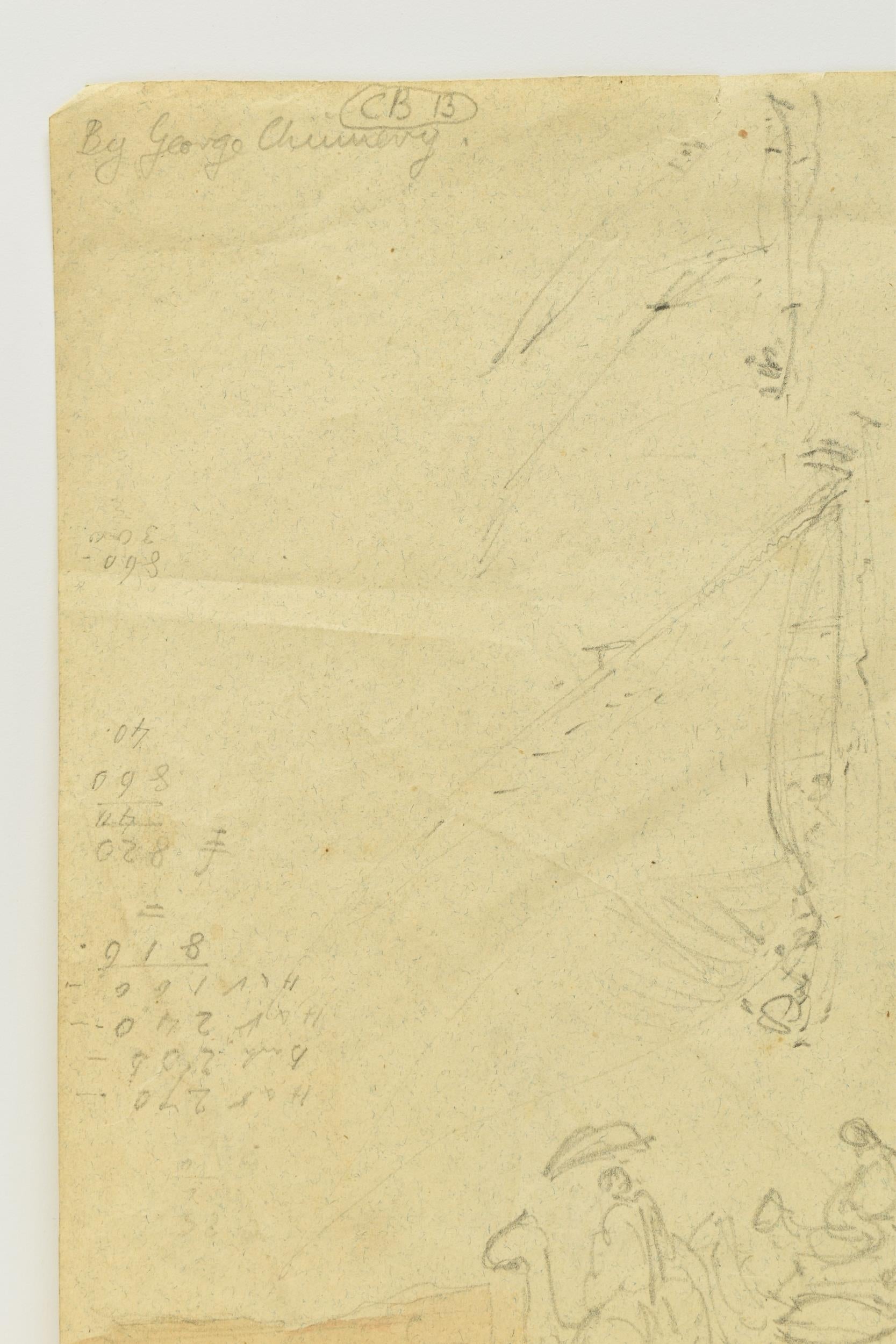 Verso are working notes and sketches of figures on camelback. The artist's planning includes more than 100 words and numbers. These appear to be an itemised, long list of proposed works. There are also costs, or sale prices, amounting to £860, circa 1820 (more than £100,000 post 2023).
