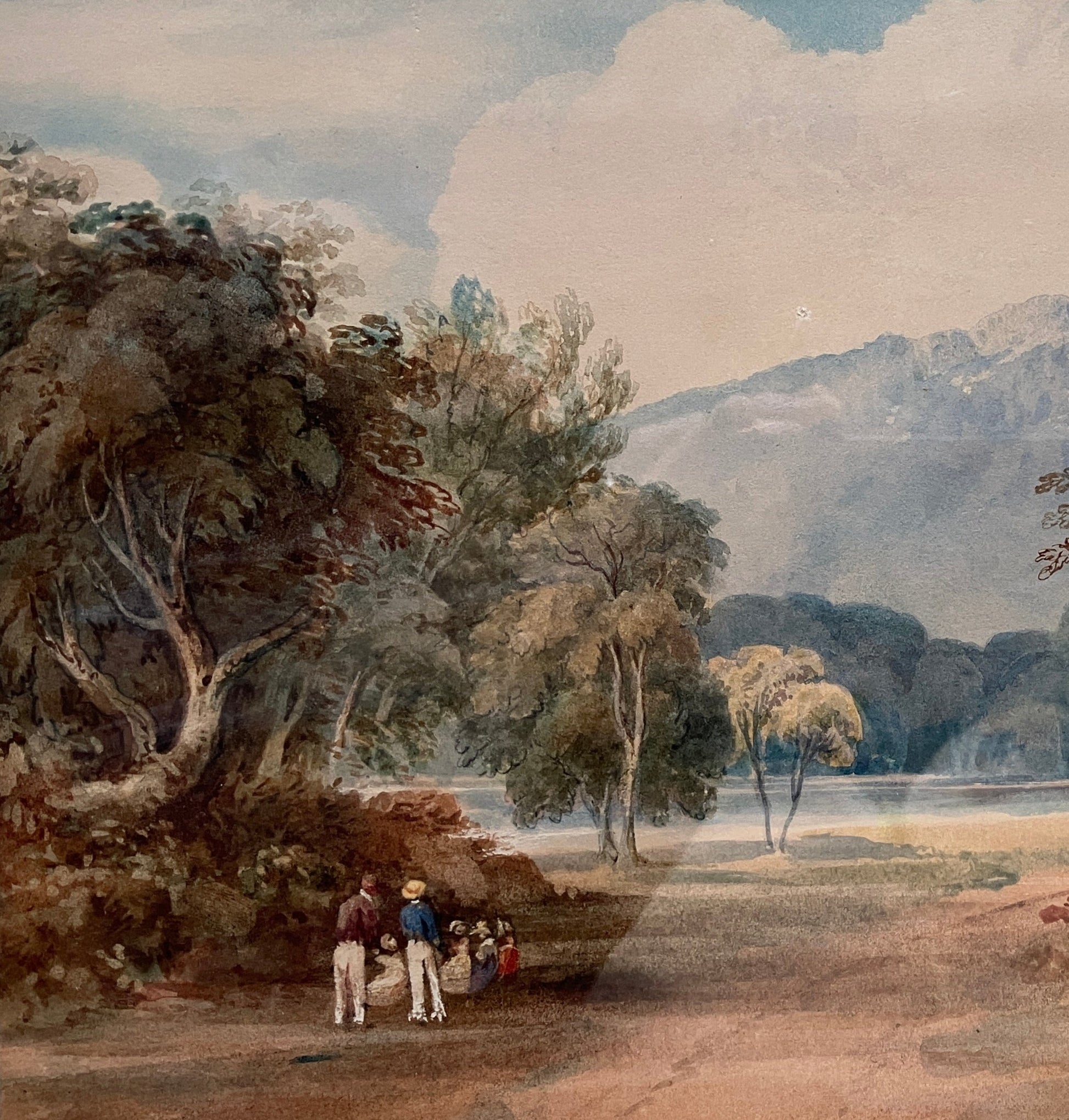 Watercolour study depicting a family wandering down to a lake before beautiful mountains, circa 1815. SN-75-527