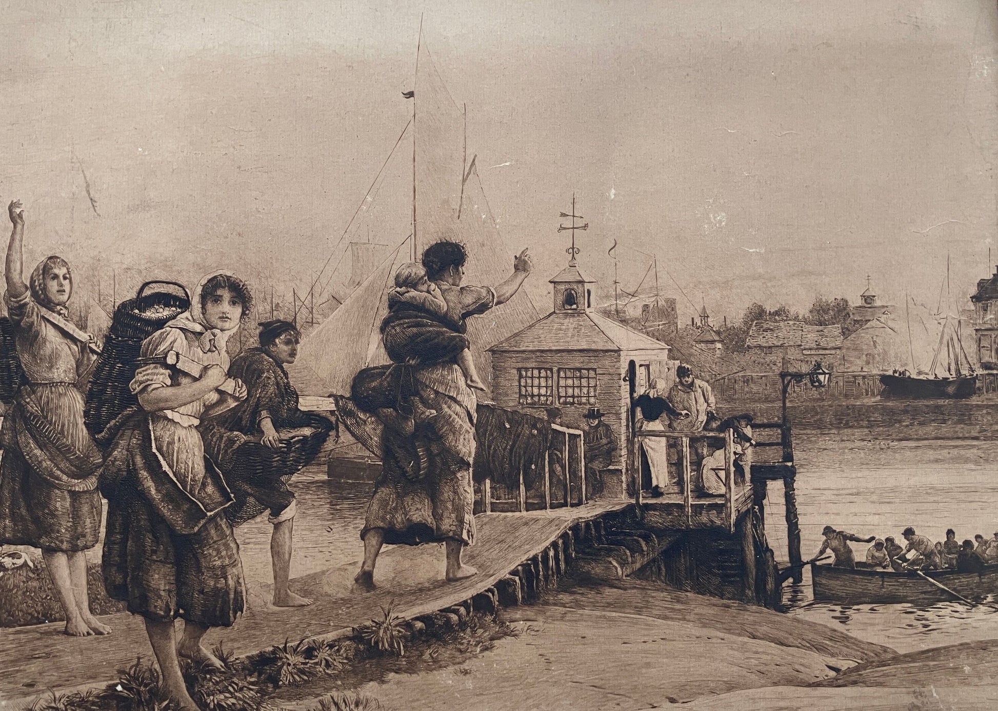 Scottish artist Robert Walker Macbeth features fisherfolk dashing for the ferry to King's Lynn, beside the River Great Ouse.
