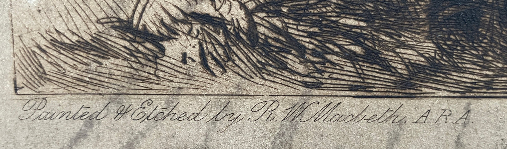 Many cropped versions of the scene were reproduced by Macbeth and others. The bottom picture is held by King's Lynn Museum. The entire scene is posted underneath that, but is not the etching available for sale here.